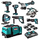- Incluye el taladro inalámbrico DDF485, el martillo perforador inalámbrico DHR171, la amoladora angular inalámbrica DGA511 y dos baterías BL1850B de 5,0 Ah cada una con cargador rápido DC18RC.